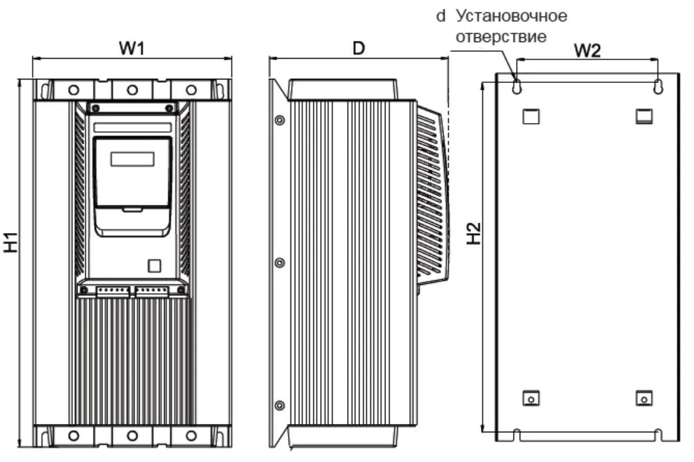 | Модель | Номинал. мощность, кВт | Номинал. ток, A | Габаритные размеры, мм | Установочные размеры, мм | Масса, кг | ||||